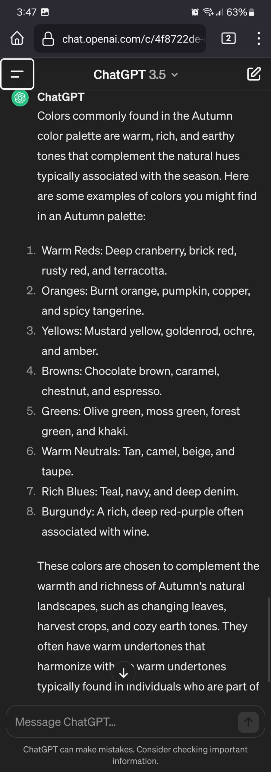 ChatGPT will start to spit out a response to your colour palette. You can further ask what colours are in autumn/winter/summer/spring to get a better understanding. As you can see, ChatGPT gave me references to colours that belong to an autumn palette.